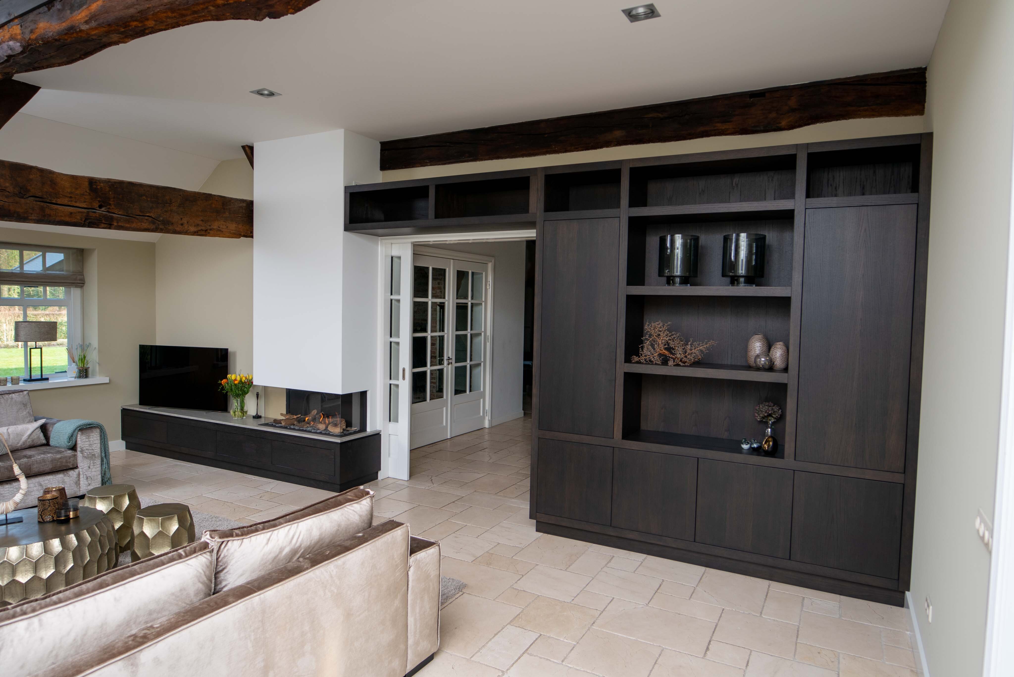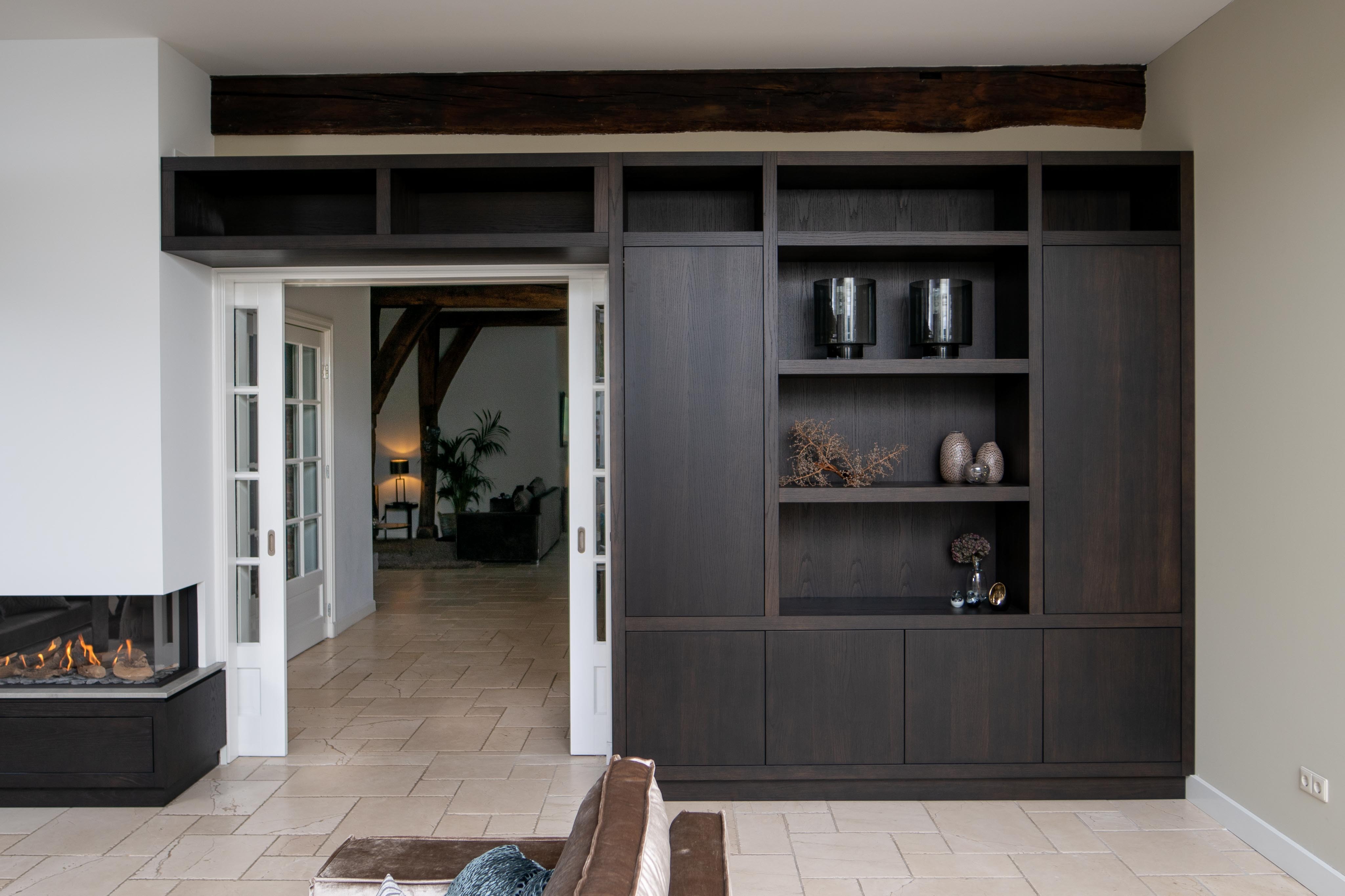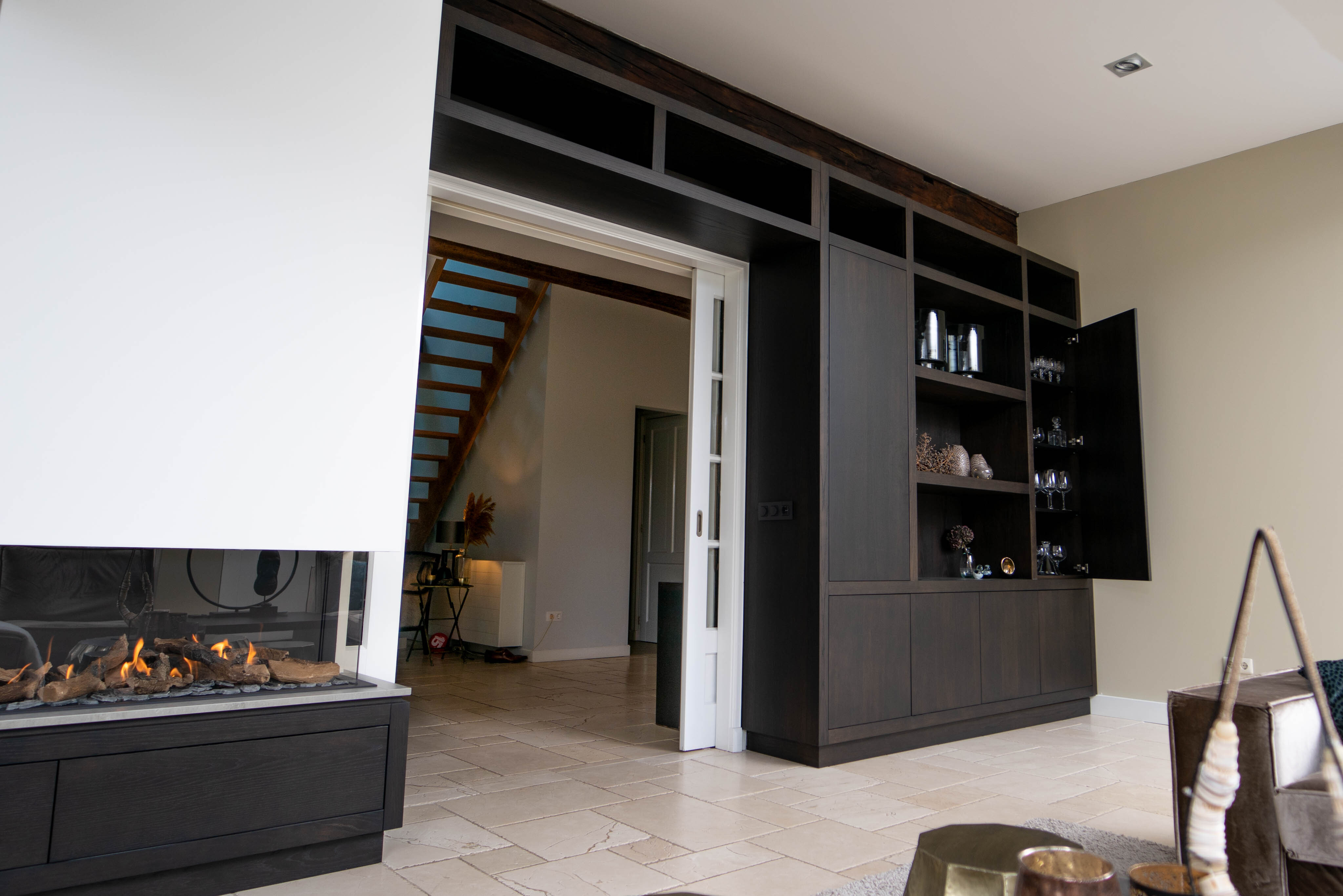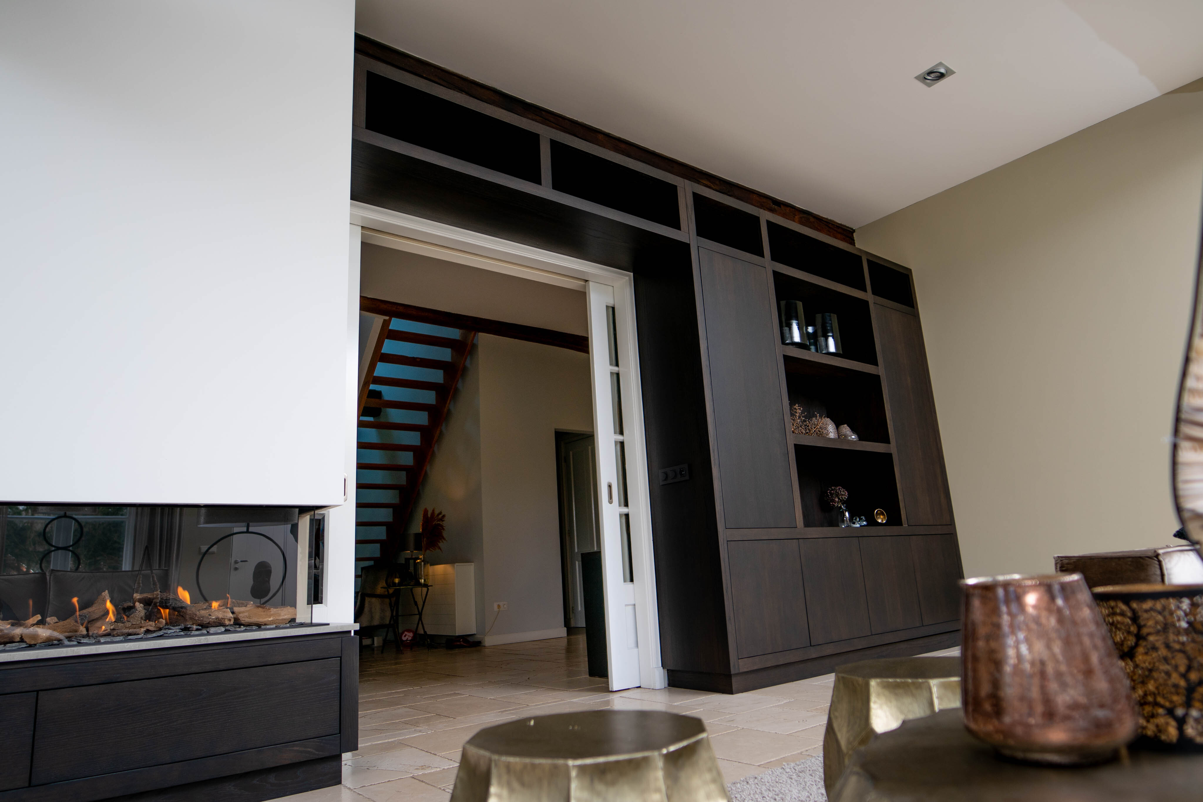 Na het inventariseren van de wensen gingen we aan de slag met een kastombouw van massief hout naast en boven de en-suitedeuren. Aan de andere zijde van deze schuifdeuren zorgden we met een bijpassende, ruime haardombouw in dezelfde kleur voor nog meer opbergruimte en een plek voor de televisie. Een prachtig sfeervol geheel!