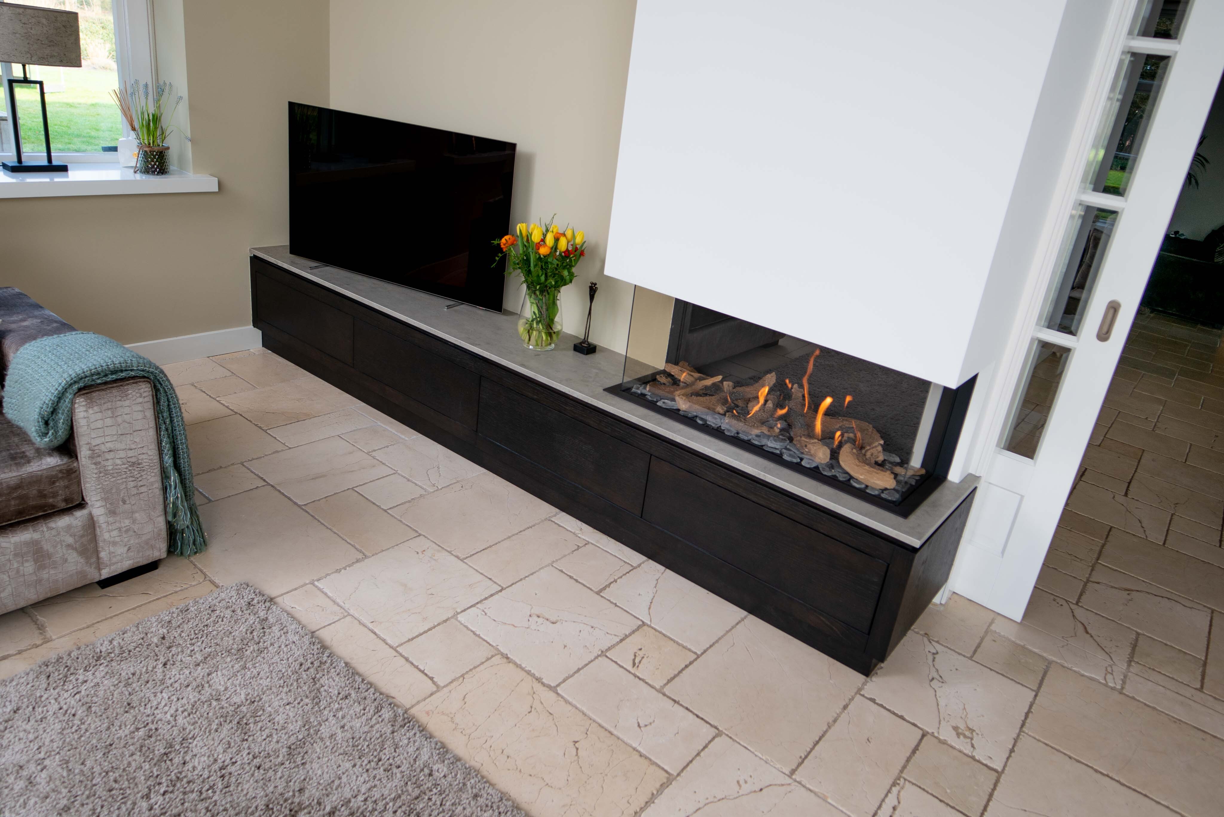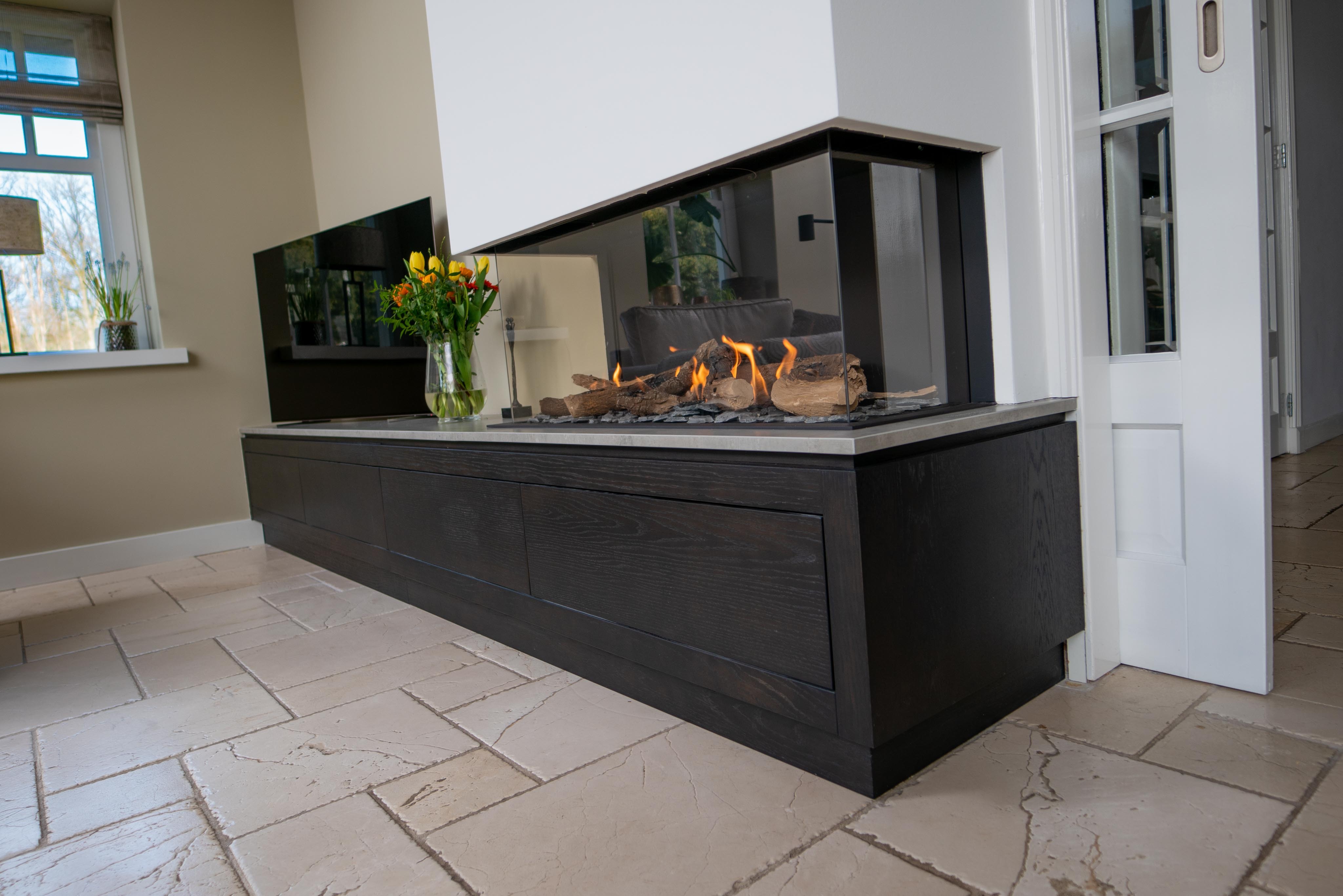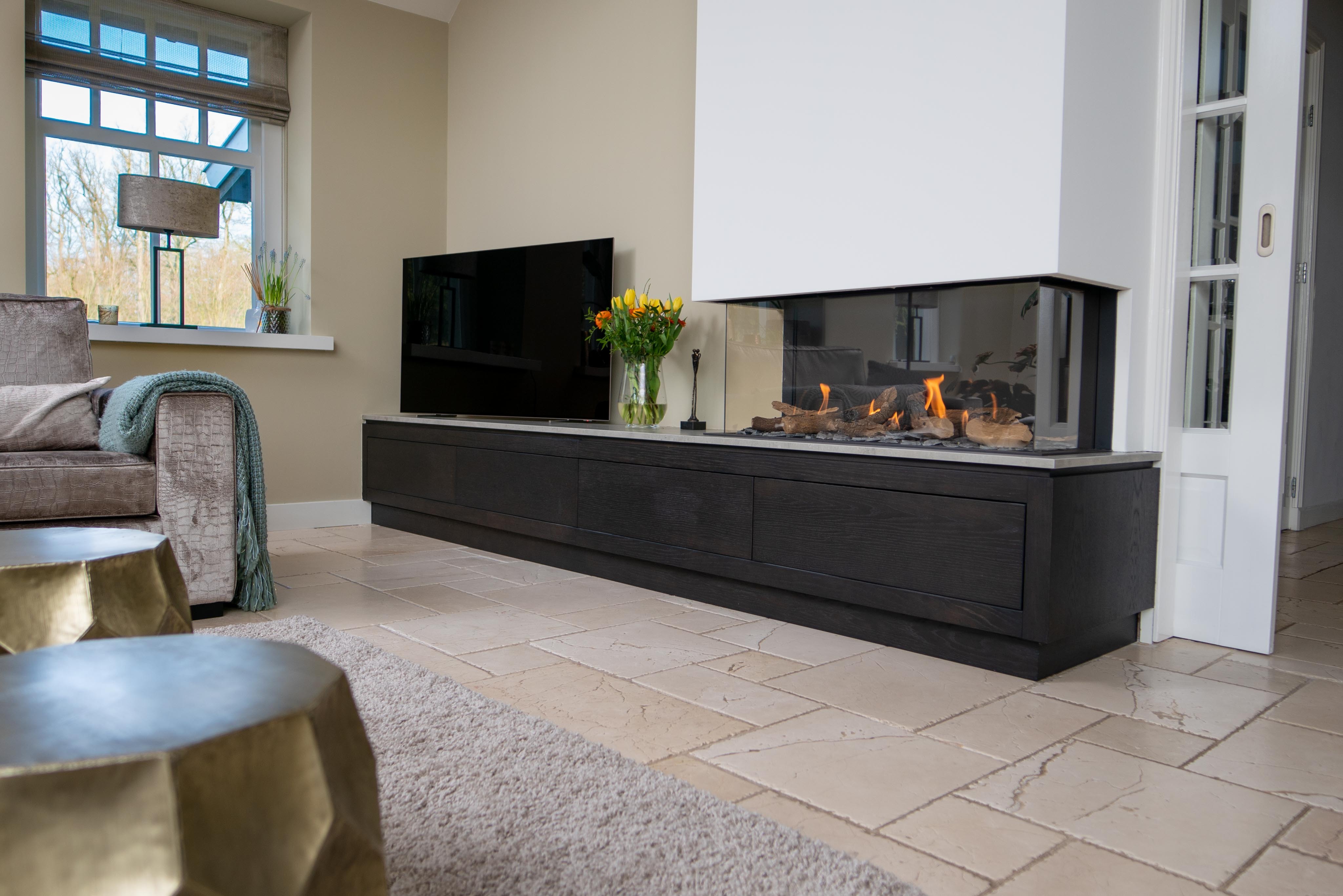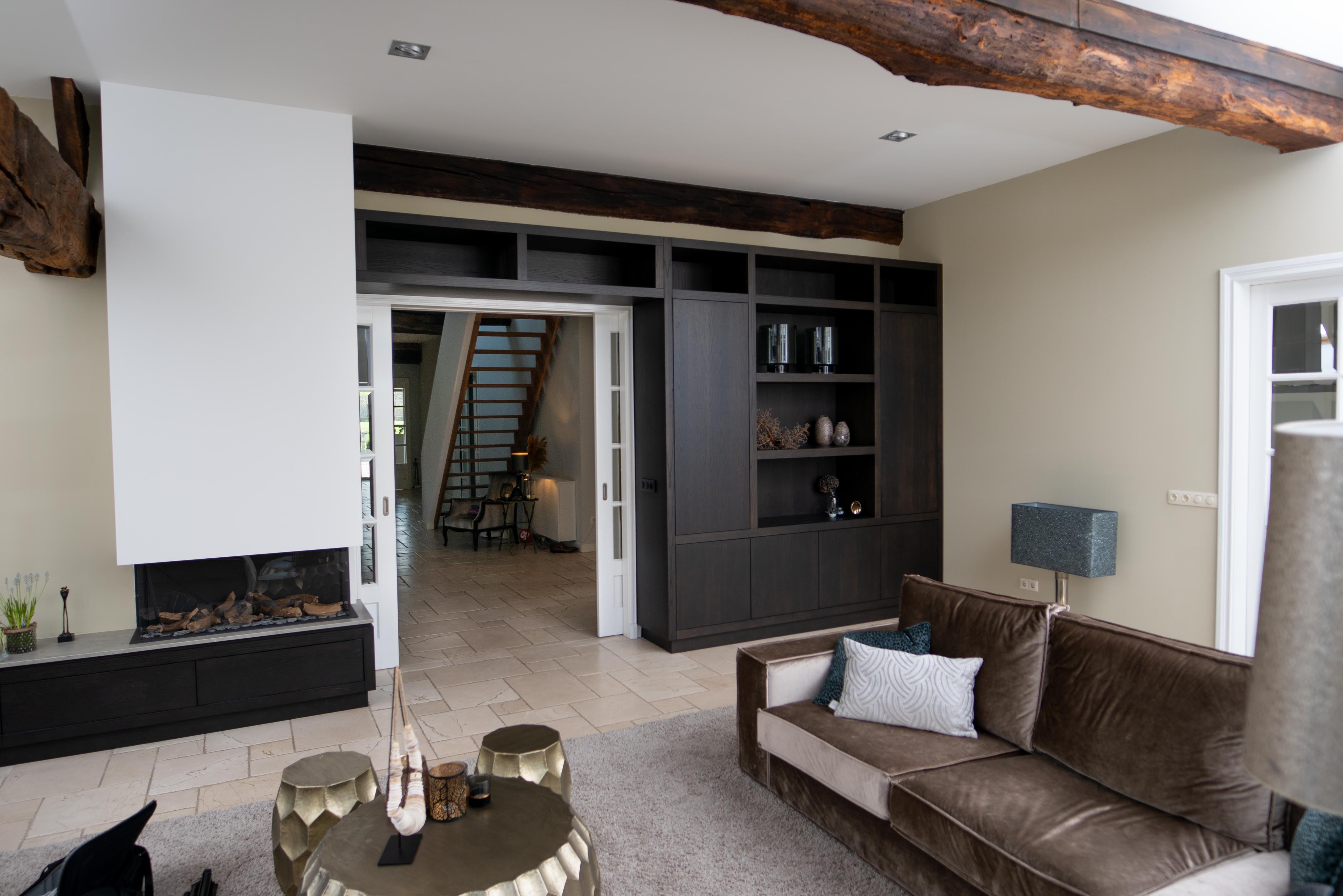 Na het inventariseren van de wensen gingen we aan de slag met een kastombouw van massief hout naast en boven de en-suitedeuren. Aan de andere zijde van deze schuifdeuren zorgden we met een bijpassende, ruime haardombouw in dezelfde kleur voor nog meer opbergruimte en een plek voor de televisie. Een prachtig sfeervol geheel!